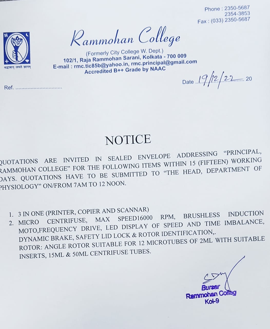 Tender Notice - Physiology Department